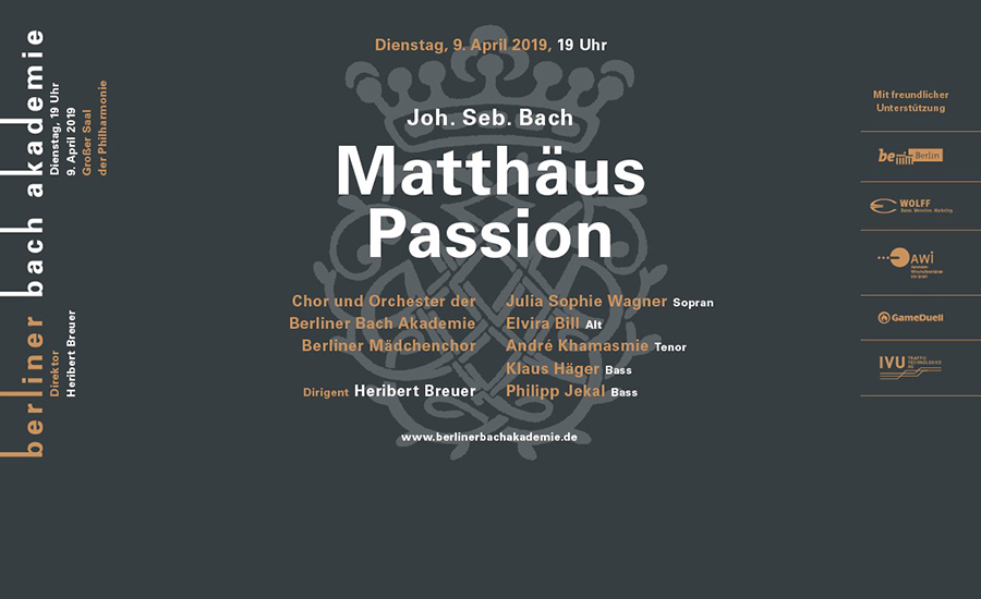Mitwirkende: Berliner Bach Akademie Chor und Orchester, Julia Sophie Wagner (Sopran), Elvira Bill (Alt), André Khamasmie (Tenor), Klaus Häger (Bass – Jesus), Tobias Berndt (Bass – Arien), Berliner Mädchenchor – Aufbauchor (Einstudierung: Eleni Irakleous und Stelios Chatziktoris)