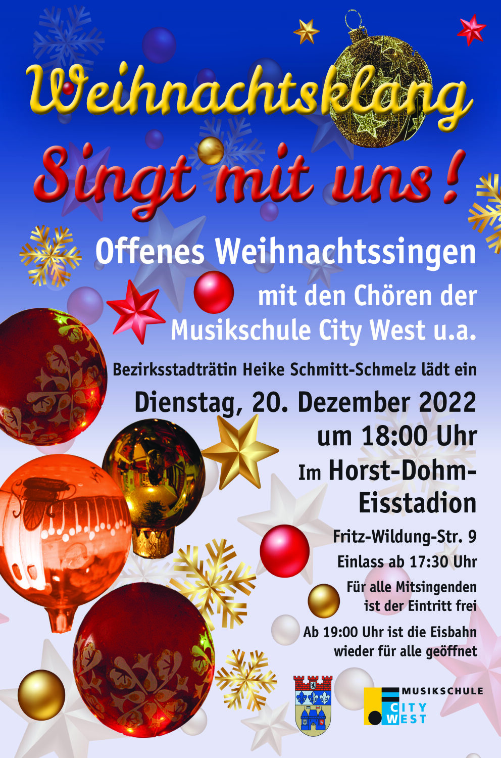 Bereits 2018 und 2019 Jahr lud die Charlottenburg-Wilmersdorfer Bezirksstadträtin für Bildung und Kultur, Heike Schmitt-Schmelz, zum offenen Weihnachtssingen mit vielen Chören im Horst-Dohm-Eisstadion in Wilmersdorf ein. Viele Sängerinnen des Berliner Mädchenchores haben mitgesungen und hatten viel Freude an dieser gemeinsamen Aktion.