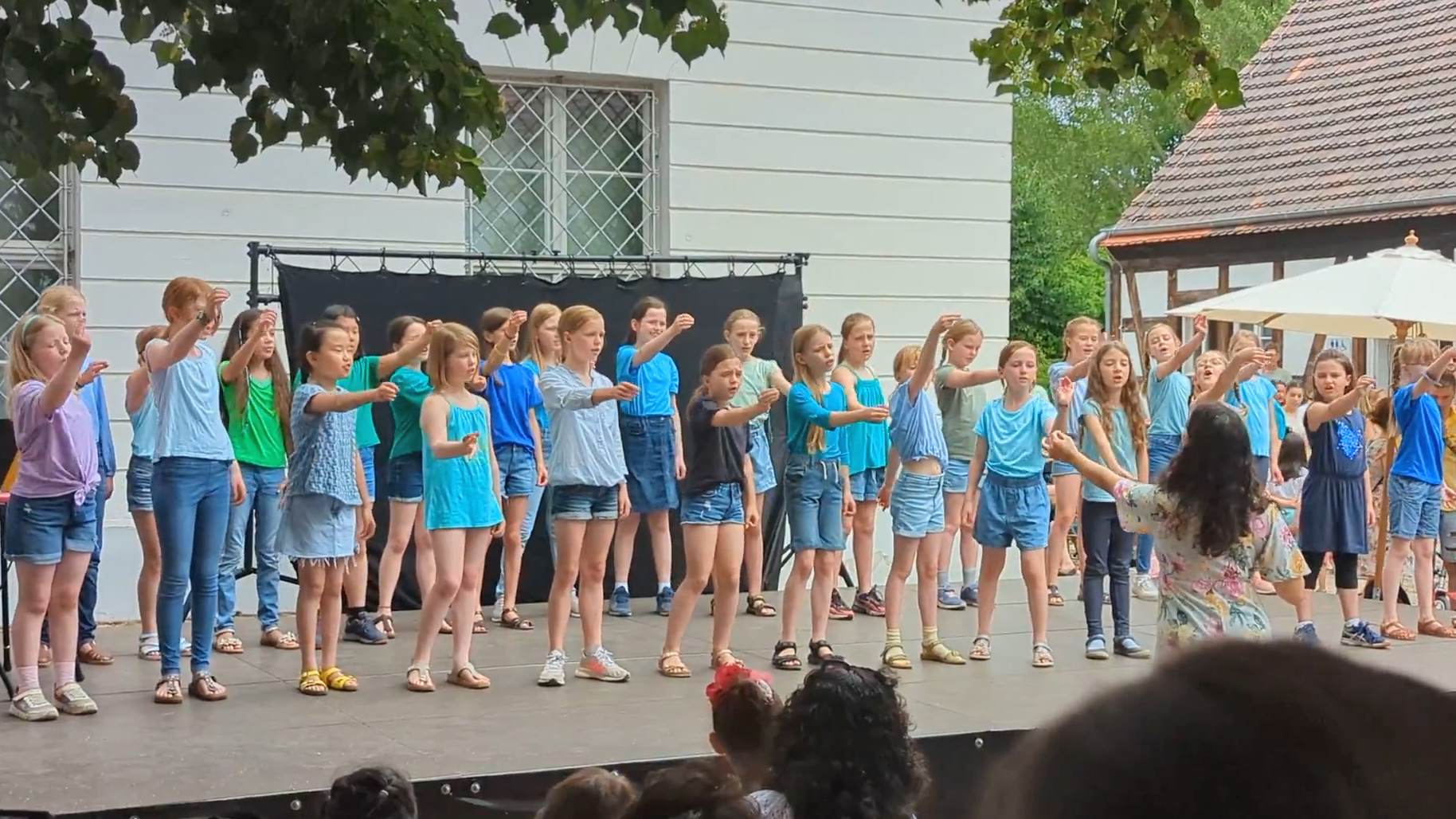 Die Mädchen sangen vor einem jungen Publikum frisch und fröhlich kindgerechte Lieder. Im Rahmen des Kinderfestivals im Hof des Jagdschlosses Grunewald, veranstaltet vom Kinderzirkus Charlottenburg in Kooperation mit der Stiftung Preußische Schlösser und Gärten, traten die kleinen Sängerinnen erstmals nach langer coronabedingter Bühnenabstinenz wieder mit in die Öffentlichkeit.