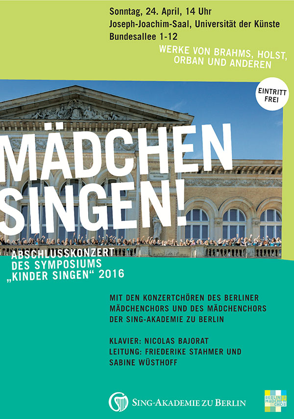 Das 7. Berliner Symposium Kinderchor „Kinder singen!“ des Berlin Career College der Universität der Künste (22.–24.04.2016) widmete sich in diesem Jahr schwerpunktmäßig der Arbeit mit Mädchenchören und -stimmen. Zum Abschluss gaben die Konzertchöre des Berliner Mädchenchores (Ltg. Sabine Wüsthoff) und des Mädchenchores der Sing-Akademie zu Berlin (Ltg. Friederike Stahmer) am Sonntag, 24. April 2016, um 14 Uhr, im Joseph-Joachim-Konzertsaal der UdK ein gemeinsames Konzert. Die erneute Zusammenarbeit dieser beiden Chöre erfolgte im Rahmen der Berliner Mädchenchor-Akademie.