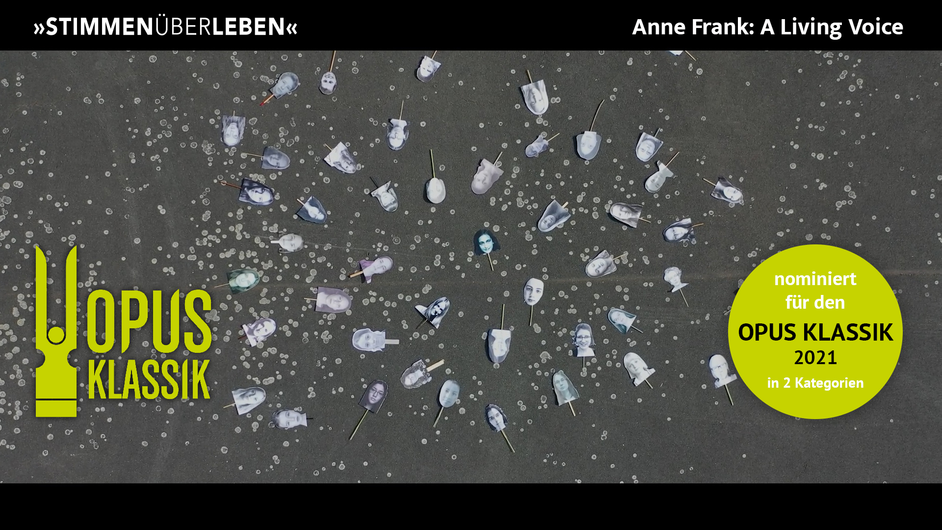 Das Projekt STIMMENÜBERLEBEN wurde in zwei Kategorien für den OPUS KLASSIK 2021 nominiert, und zwar in den Kategorien „Nachwuchsförderung“ und „Publikums- und Partizipationsprojekte“.