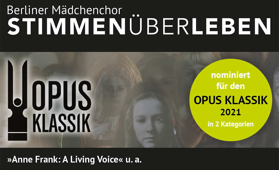 Das Projekt STIMMENÜBERLEBEN wurde in zwei Kategorien für den OPUS KLASSIK 2021 nominiert, und zwar in den Kategorien „Nachwuchsförderung“ und „Publikums- und Partizipationsprojekte“.