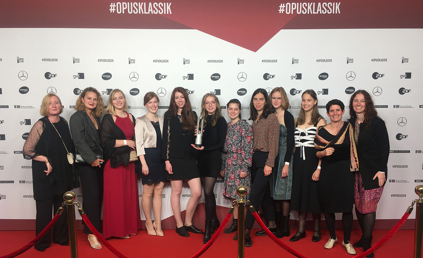 Ein OPUS KLASSIK ging 2021 für »STIMMENÜBERLEBEN« an den Berliner Mädchenchor. Die Preisverleihung fand am 10. Oktober 2021 im Konzerthaus Berlin statt. An der Pressewand stellten sich den Fotografen (v. l. n. r.): Nicola von Amsberg (Förderverein), die Sängerinnen Nora Tuchelt, Rebecca von Amsberg, Julia Bonk, Johanna Sträter, Elisha Wrobel, Margarete Zepter, Marie Kott, [...more]