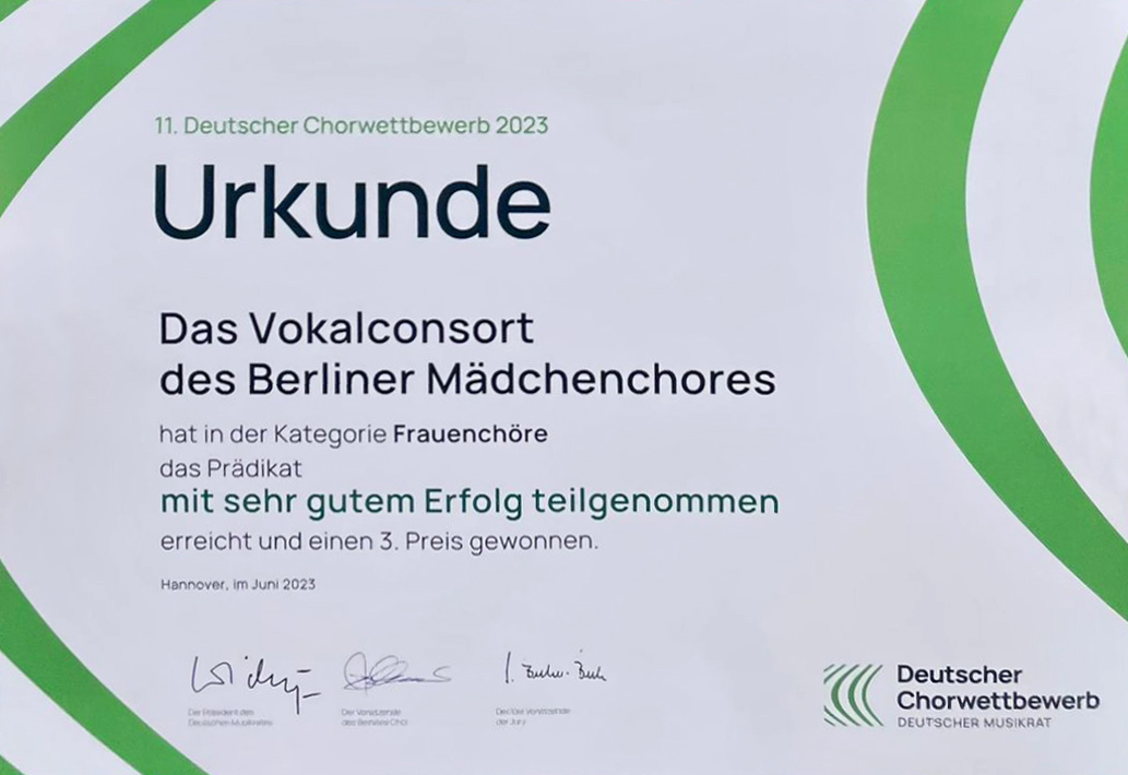 Beim 11. Deutschen Chorwettbewerb erreichte das Vokalconsort, der junge Frauenkammerchor des Berliner Mädchenchores, einen hervorragenden 3. Preis hinter Carrée Chanté aus Mannheim und dem 4×4-Frauenchor aus Heidelberg.